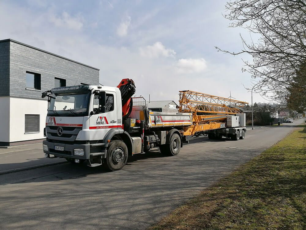 Unser Fuhrpark umfasst diverse Pritschen, einen Liebherr Turm-Dreh-Kran (HM200), einen Böcker Schrägaufzug, einen Mercedes-Benz Azor Dreiseiten-Kipper mit Pallfinger-Ladekran, sowie einen Transport-LKW auf MAN-Fahrgestell. Zudem bieten wir unseren Mobilkran MKG auf einem Mercedes-Benz Actros-Fahrgestell zur Vermietung an.
